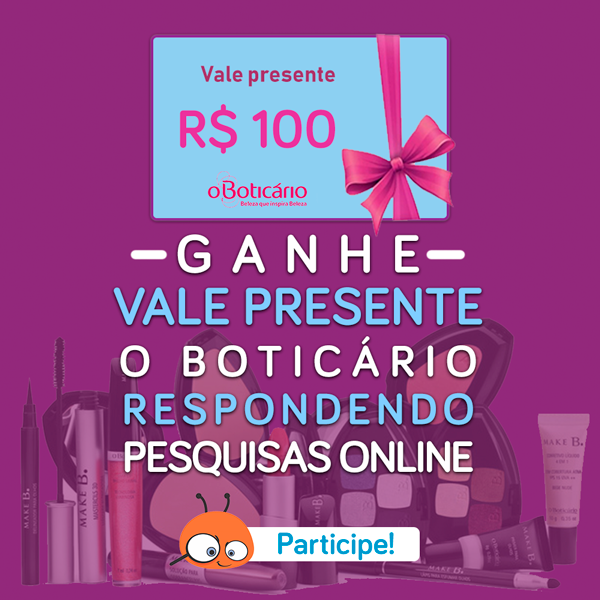 Você que gosta de responder pesquisas, olha só a oportunidade que você tem, de ganhar um vale presente de R$ 100 na Boticário.