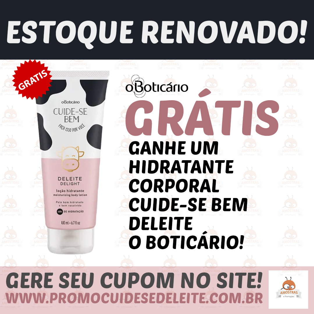 Todas as segundas, quartas e sextas-feiras, a meia noite, O Boticário faz reposição do estoque de brindes do novo Hidratante Corporal Cuide-se bem Deleite, de 100ml. Se você ainda não conseguiu, porque o estoque esgotou rapidamente no dia em que liberou para todos, agora você tem uma nova chance.