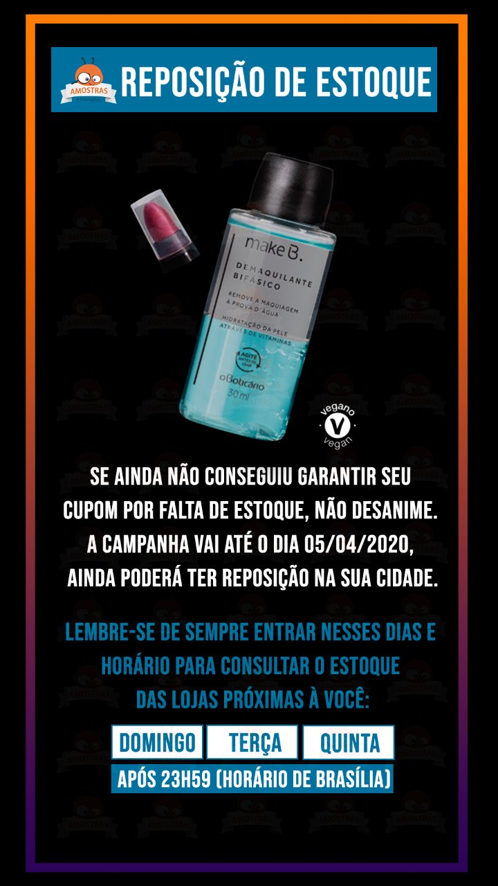 Olá Lindezas, vim informar que todos os Domingos, Terças e Quinta-Feiras, após as 23:59, O Boticário faz reposição do estoque de brindes do kit composto por 1 Demaquilante Bifásico Make B. de 30ml, e 1 Mini Batom da nova linha de Batons Make B com ácido hialurônico. Se você ainda não conseguiu, porque o estoque esgotou rapidamente no dia em que liberou para todos, agora você tem uma nova chance.