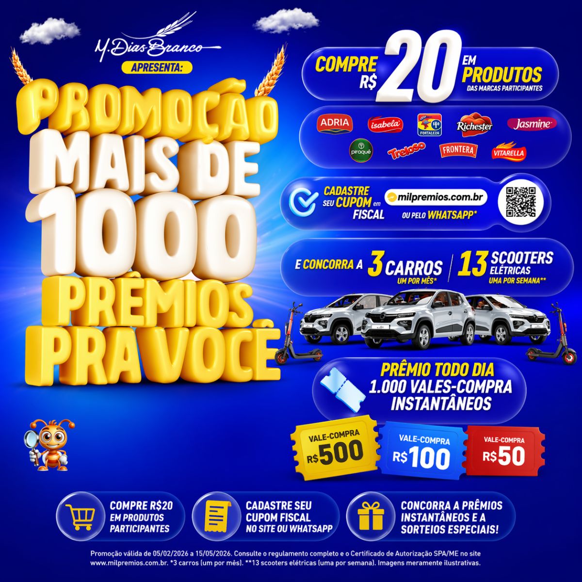 Uma nova promoção acaba de chamar atenção no Brasil e já está entre as mais buscadas: a campanha Mais de 1000 Prêmios pra Você, da M. Dias Branco, promete distribuir vales-compra, carros e scooters elétricas para consumidores em todo o país. São muitos prêmios instantâneos! Você pode participar até 18/05/2026.