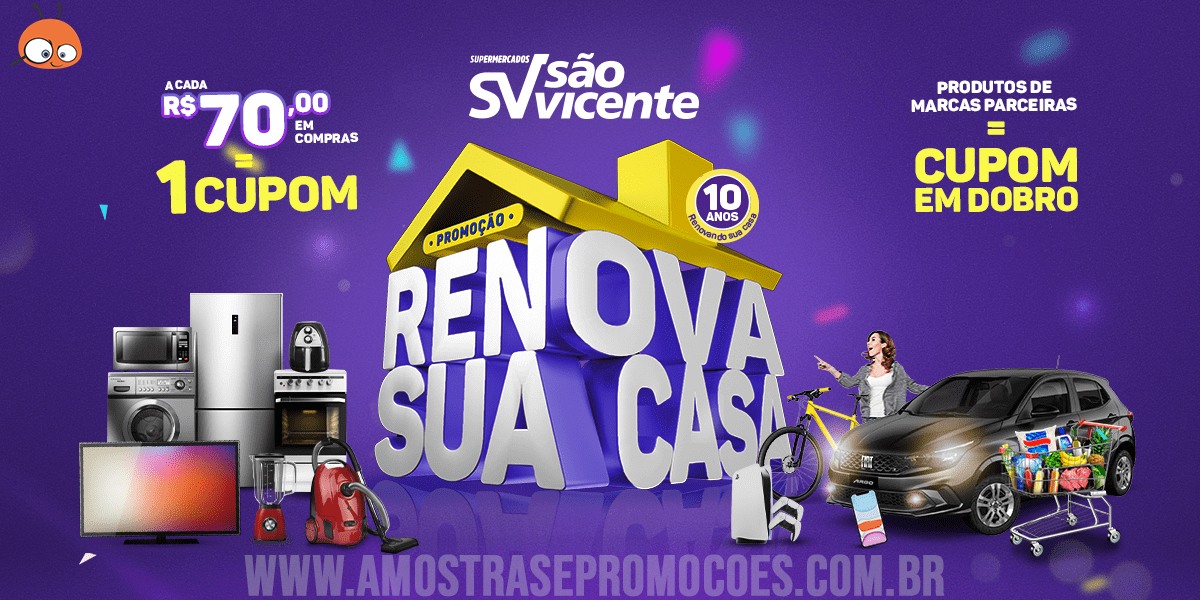Participe da super promoção “Renova Sua Casa”, a cada R$ 70 em compras, você concorre diversos prêmios além de deixar sua casa renovada. A promoção distribui cerca de R$369.962,63 em prêmios. É muito fácil de ganhar, se liga só!