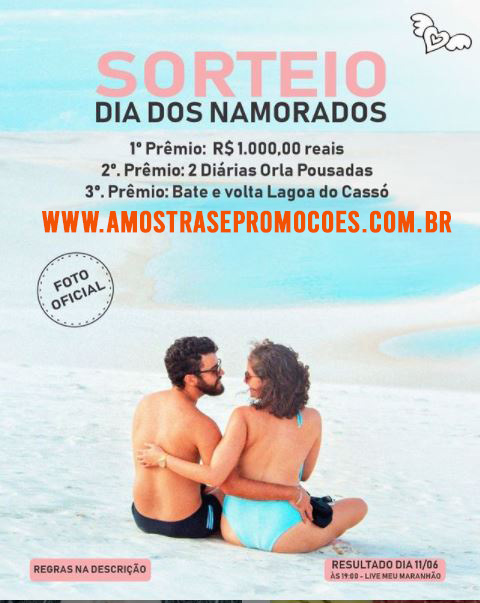 Se liga no Sorteio de dia dos Namorados que o @meumaranhao preparou pra você e seu amor… No qual vocês irão ganhar 1 prêmio no valor de R$ 1.000, 2 diárias na Orla Pousadas ou um bate e volta na Lagoa do Cassó uau só prêmio top hein! Não deixe de participar, concorra esses super prêmios.