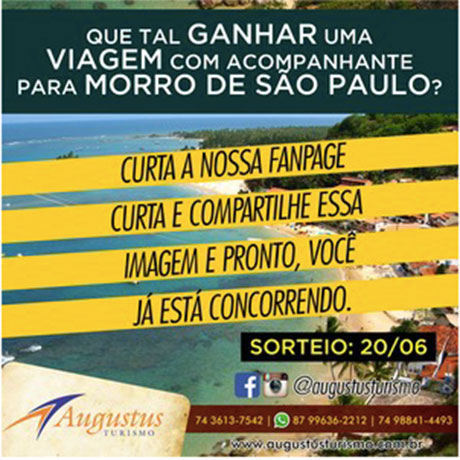 Concorra a Viagem com acompanhante para Bahia Para participar desta Promoção da página Augustus Turismo, CLIQUE AQUI, leia o regulamento e clique em “Quero Participar”! O sorteio será realizado em …