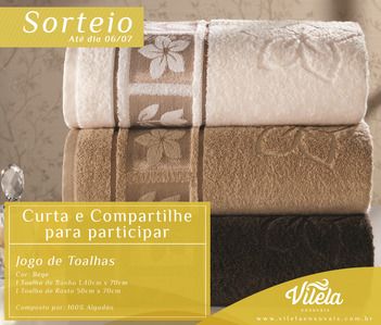 Concorra a um lindo Jogo de Toalhas! Para participar desta Promoção da página Vilela Enxovais, CLIQUE AQUI, leia o regulamento e clique em “Quero Participar”! Você pode participar até 06/07/2015! …