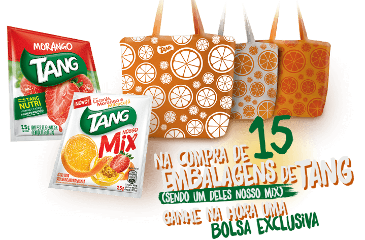 A Tang está realizando uma promoção que todos vão amar! Na compra de 15 embalagens tang, incluindo uma de tang Mix, você ganha na hora uma linda bolsa exclusiva! Não fique de fora dessa! para saber as lojas participantes mais próxima de você é muito fácil.