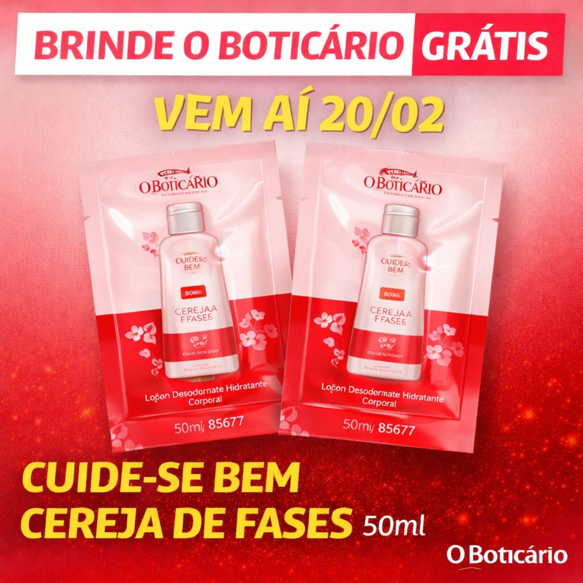 O O Boticário está com uma nova promoção nacional que está chamando a atenção de quem ama brindes de beleza. Na campanha Ação de Fluxo Cuide-se Bem Cereja de Fases, consumidores elegíveis podem resgatar de brinde, a Loção Desodorante Hidratante Corporal Cuide-se Bem Cereja de Fases 50ml. A promoção acontece entre 20 de fevereiro e 06 de março de 2026, ou enquanto durarem os estoques, e é válida em todo o Brasil